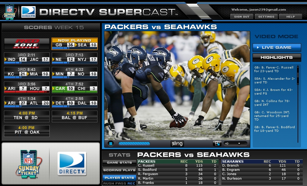 Check out the image, see the logo centered under the video image? No? Well, try the larger version of the image. See it now? Yeah, that’s the Sling Media logo. DirecTV is working with Sling Media in their NFL Supercast.